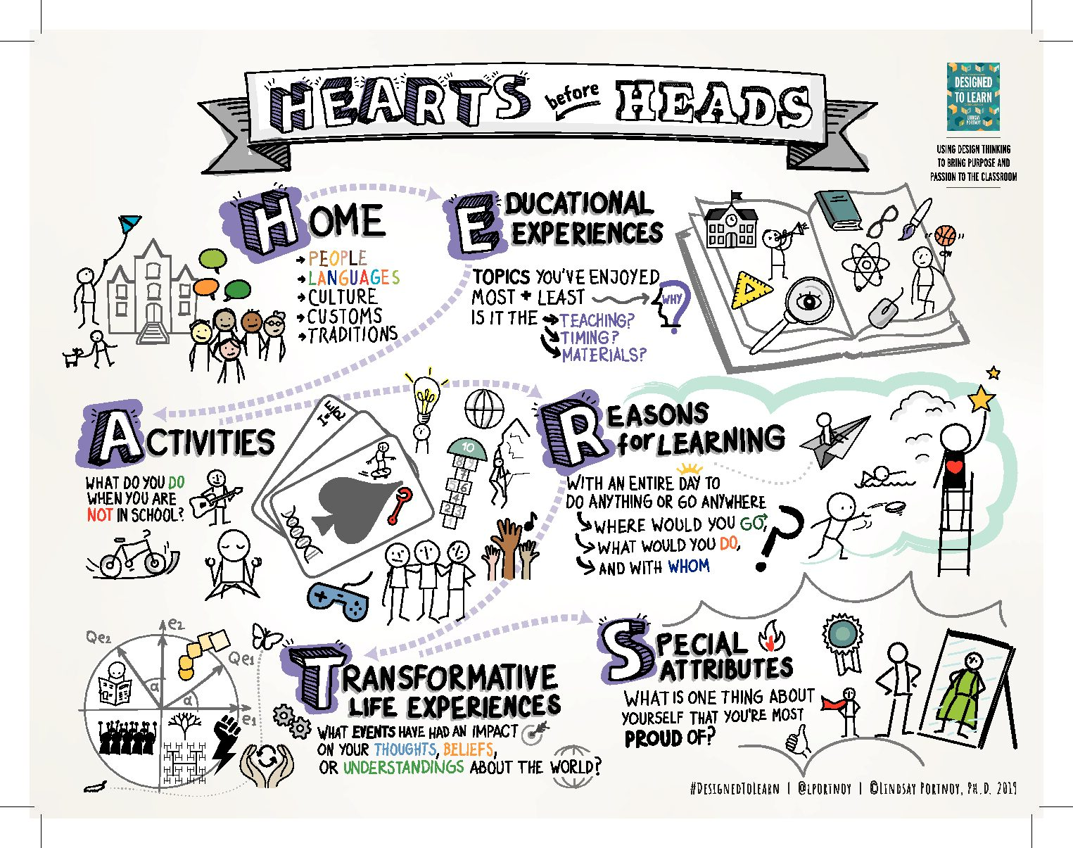 One of my favorite activities for connecting learning to students' lives was created by Dr. Lindsay Portnoy, author of the book Designed to Learn. In this activity, teachers invite students to share important details about their lives so that you and your students can learn more about each other. The wonderful thing about this process is that it has the potential to help build strong classroom connections as well as provide you with helpful information that can be used to tailor learning activities to each student's unique needs and lived experiences. In this process of self-exploration, Dr. Portnoy provides "a visual sketchnote as the prompt when asking learners about their lived experiences in order to connect each dynamic individual to the exciting learning" she has designed for them:
