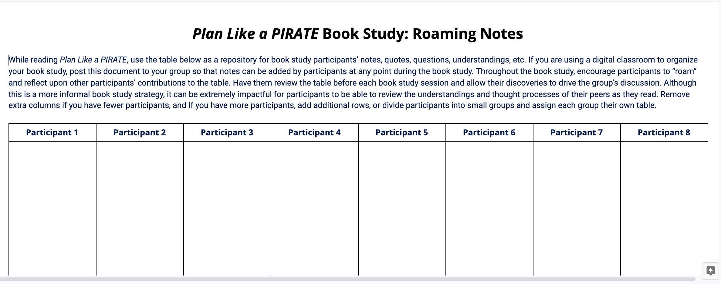While reading Plan Like a PIRATE, use a table like the one below as a repository for book study participants’ notes, quotes, questions, understandings, etc. If you are using a digital classroom to organize your book study, post the document to your group’s page so that notes can be added by participant at any point during the book study. Throughout the book study, encourage participants to “roam” and reflect upon other participants’ contributions to the table. Have them review the table before each book study session and allow their discoveries to drive the group’s discussion. Although this is a more informal book study strategy, it can be extremely impactful for participants to be able to review the understandings and thought processes of their peers as they read. If you have more participants, add additional rows, or divide participants into small groups and assign each group their own table.
